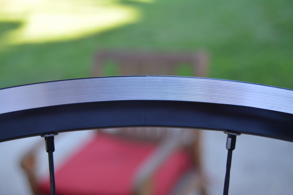 Unfortunately, when the wheels arrived, UPS had driven a fork-lift in to the box. As a result, the rear rim was dinged and had a small but noticable chunk removed from it. You could feel it with your fingers and the brakes would pulse over it. I alerted Fair Wheel Bikes; they were busy at Interbike but told me to send the rear wheel back at my convenience so they could replace the rim. Meantime, they said, go ahead and ride on them. Wow, that was impressive customer service! Regarding build quality, the hubs are stunning and minimalist. The seam of the Kinlin rim is barely perceptible, and the rim strip is elegantly translucent.