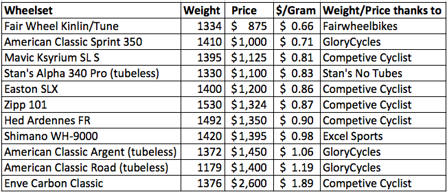 You'll note that while the Fair Wheel wheelset wasn't the absolute lowest wegiht, it is by far the lowest cost per gram. To this end, I decided to try out what Fair Wheel Bikes had to offer.