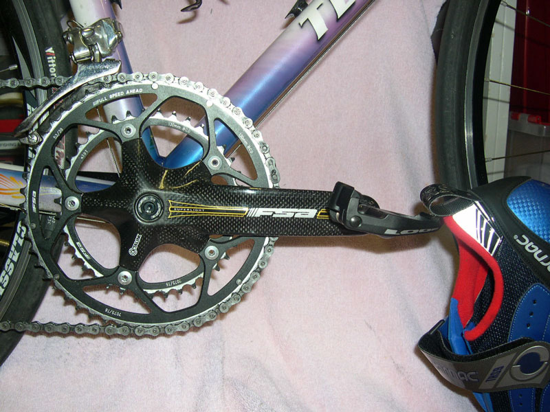 FSA Superlight cranks, Look Keo Titanium pedals, and new "Gene Simmons" Carnac shoes. FSA cranks are much stiffer than 9-speed Dura Ace, and lighter by 80 grams. Keo pedals weigh ~2 grams less than Speedplay Stainless pedals and offer larger contact area.
