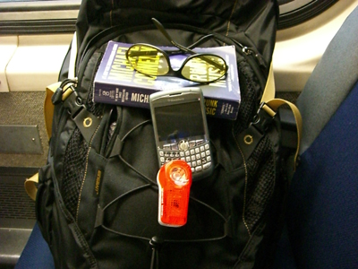 passengers, they were in agreement. This picture below shows the "essentials"--book, crackberry, backpack, sunglasses, and light. Most people also carry their ipod.