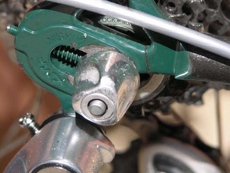 Larry Norris used this as a cross bike for 2003. It came back with a hole in the left chainstay (photo below, outside) which was filled by John Tellarico/Bicycle Outfitters. I just noticed that the right rear dropout also has cracked completely through.