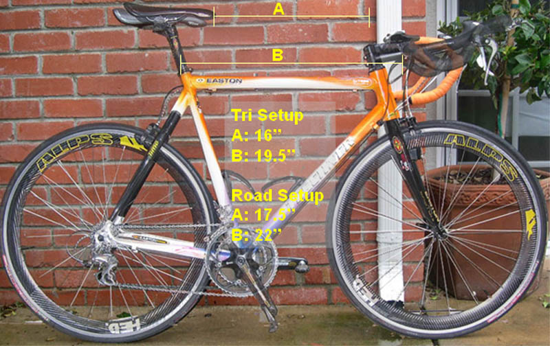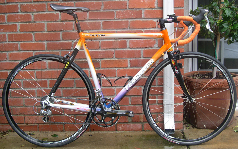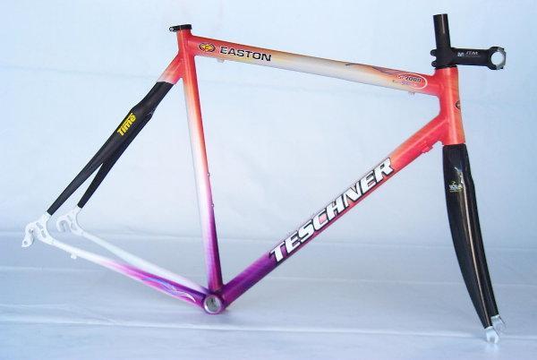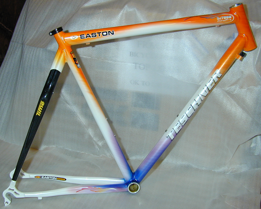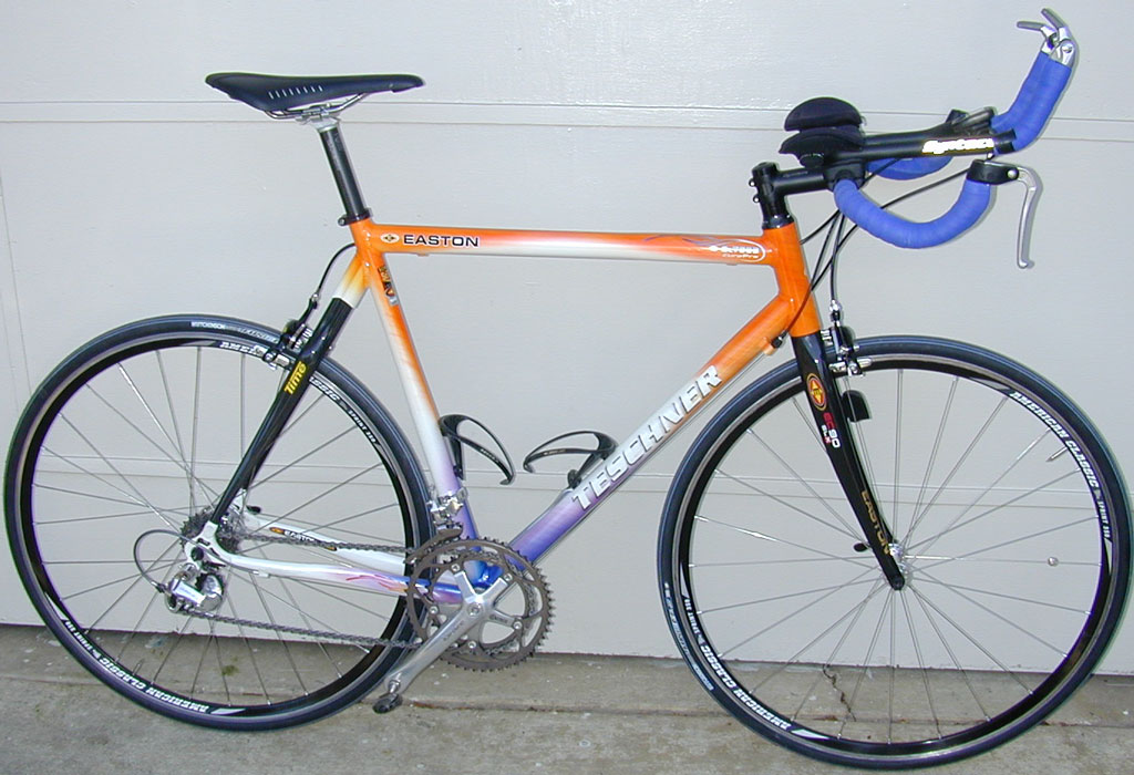 he persuaded me to get one new from How does it ride? Fantastic! Much stiffer in the bottom bracket than the Fuji it is replacing. At the same time, the ride is very smooth; bumps are ironed out. Accelerates instantly. Handling is very stable. After burning out in the early '90s, it's got me excited about cycling again. This year (2004), turned in my fastest bike split at the Donner Lake Triathlon on this bike--the 6th time raced since 1990, and 6 years older. Specs: 2 lb 8 ounce frame with 73.5 degree seat angle (triathlon-biased), 73 degree head angle. Features Easton Scandium tubes, Easton SLX fork (300 gram), Time carbon seat stays with curved Scandium seat stays. Update 2/19/05: Just under 15lbs. Nothing too scary light except tires and lunar light tubes. Zero Gravity brakes feel very secure and seem to brake as well as previous Mavics. Update 3/13/05: lunar light tubes plus Vittoria ultra light tires = two flats in two rides. So I've replaced with heavier Continental tubes. Also put regular Dura Ace cables on. As a result, bike is now 15 lbs 3 oz, but pretty much no longer fragile but still damn light. Weight with Syntace triathlon bars is 16 lbs even. 12/29/07: Upgrade to 31.8: FSA SLK Compact road bars (225 gram), Ritchey WCS 4-axis stem (115 grams). Vs TTT Less Stem (130) and Easton EC90 Equipe (195). 10 gram more on scale. Teschner Website | Cycling News Reviews/Articles | Cycling News Photo |