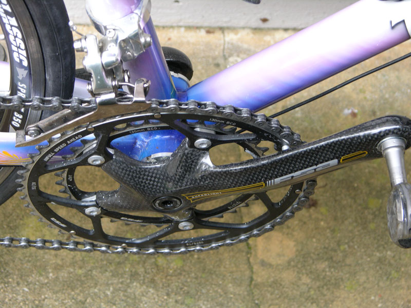 FSA Superlight cranks, Look Keo Titanium pedals, and new "Gene Simmons" Carnac shoes. FSA cranks are much stiffer than 9-speed Dura Ace, and lighter by 80 grams. Keo pedals weigh ~2 grams less than Speedplay Stainless pedals and offer larger contact area.